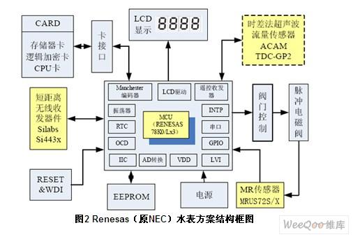 水表的電源一般由水表自行供給,這就對水表的功耗提出了苛刻的要求。國際規(guī)定,智能水表的靜態(tài)電流應(yīng)該小于30μA,實際中水表廠商都把該指標(biāo)控制在10μA以內(nèi)(使用干簧管傳感器時),保證工作時間大于6年以上才算合格。NEC帶LCD控制功能的8位微控制器以其低功耗、高性能等優(yōu)勢,成為水表微控制器的優(yōu)質(zhì)選擇。 1 NEC山梨MR和Renesas MCU水表方案 該方案的工作原理為:在葉輪上裝上磁鐵,由磁場感應(yīng)器(MR Sensor)感知出葉輪的旋轉(zhuǎn)。磁場感應(yīng)器(MR Sensor)把磁場信號轉(zhuǎn)變成電信號,再由單片機進行計量的加法或減法運算,運算值由液晶顯示或?qū)ν獠枯敵。如圖1所示
